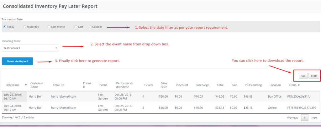 The Consolidated Pay Later Report will provide you the unpaid transaction details like Ticket Buyer Name, Event Name – Date, ticket count for each transaction and ticket amount to be paid for each transaction. This report also allows you to view transactions for a different event and different performance dates.